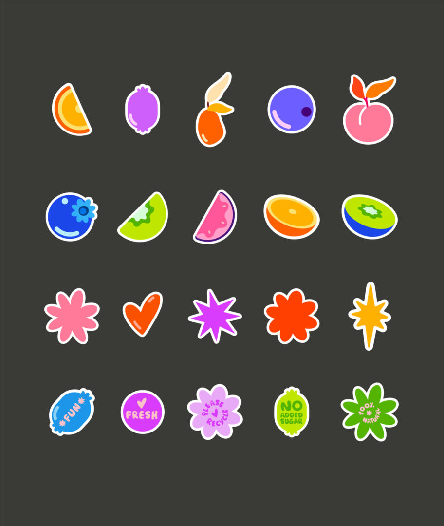 สีหลักของแบรนด์ได้รับแรงบันดาลใจจากธรรมชาติที่เบ่งบาน โทนสีธรรมชาติแต่สดใสซึ่งหาได้ง่ายในช่วงฤดูใบไม้ผลิและฤดูร้อน เช่นเดียวกับส่วนผสมของเรา สีเหล่านี้ให้ความสนุกสนาน เข้มข้น และออกแบบมาเพื่อครองสื่อการตลาดทั้งหมด ในขณะที่สีที่เข้าใจฉลากนั้นเป็นสีเดียวที่มาจากรสชาติผลไม้แต่ละชนิด